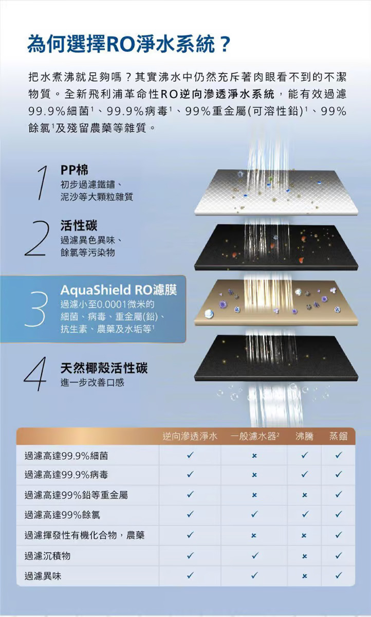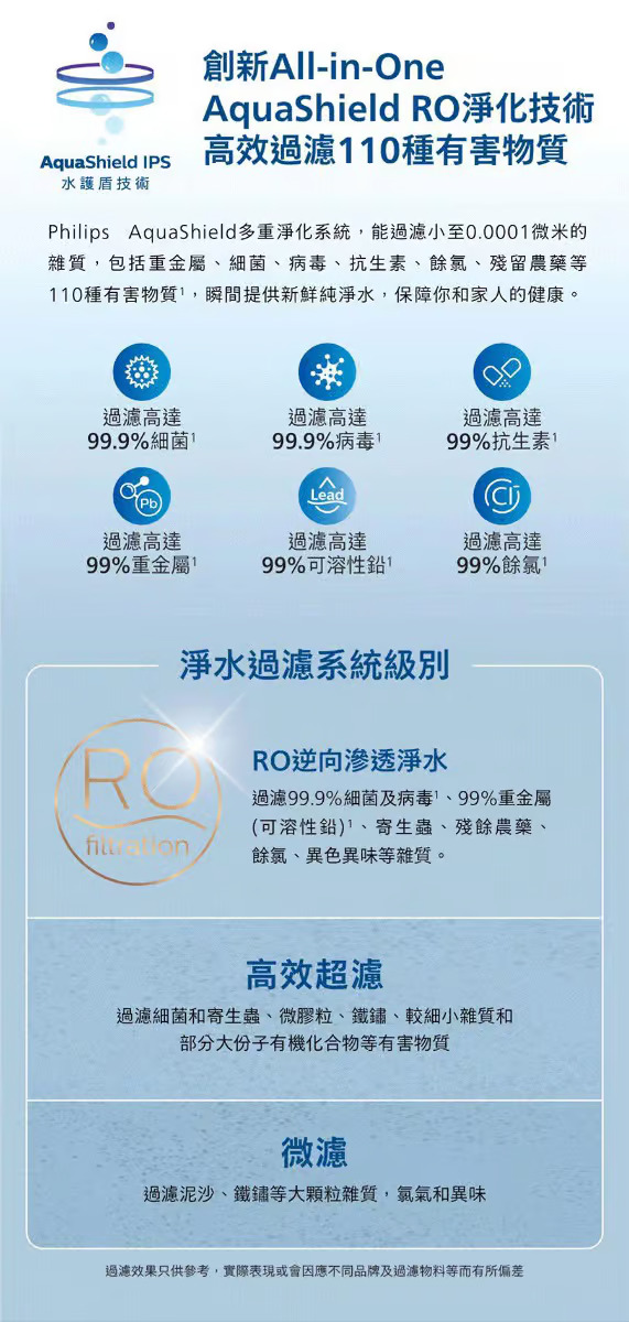- 深層逆滲透過濾可以有效濾除小至 0.0001 微米的多種污染物,例如氯、重金屬、農藥、細菌,甚至病毒*。產品還可以降低水的硬度