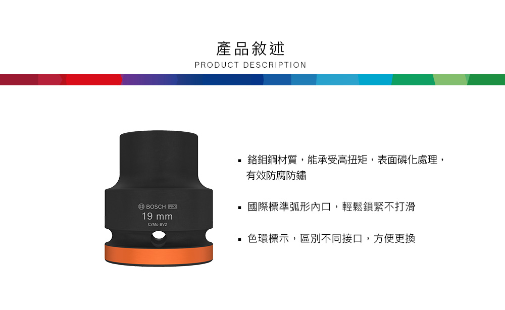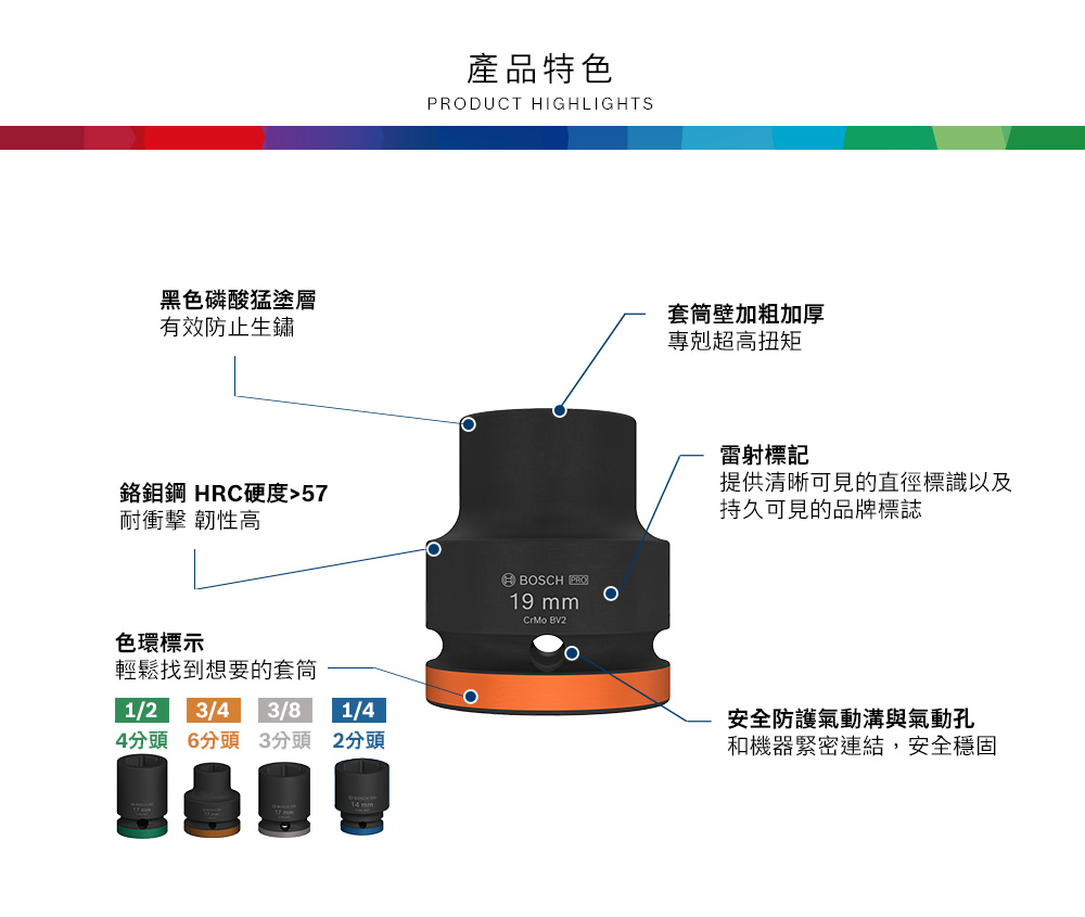 - 鉻鉬鋼材質,能承受高扭矩,表面磷化處理,有效防腐防鏽