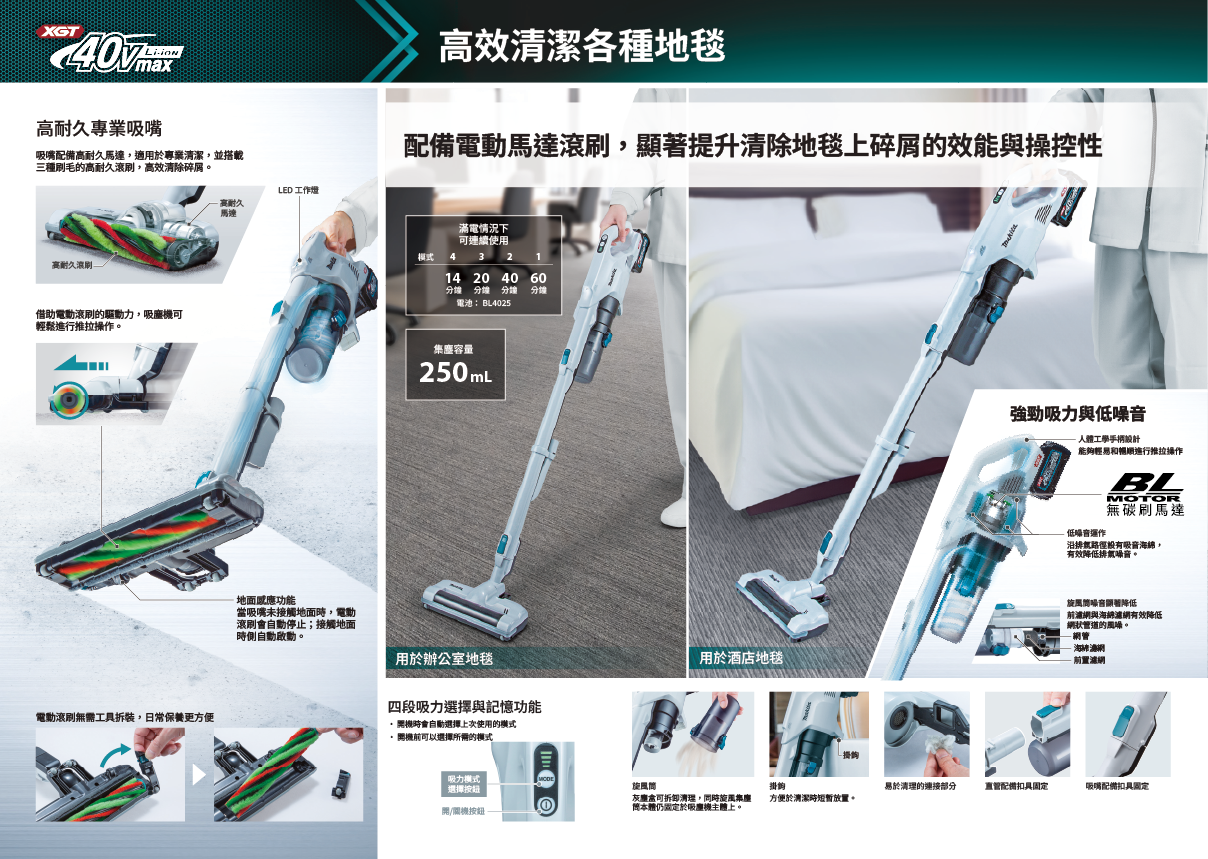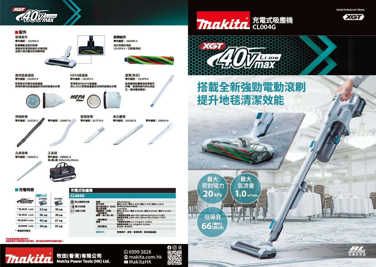 - CL004GD101套裝: CL004G 吸塵機, DC40RA 快速充電器, BL4025 電池1pc