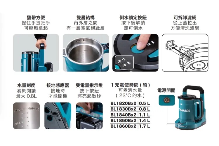 - 具有雙重安全蓋鎖設計,防止熱水意外流出