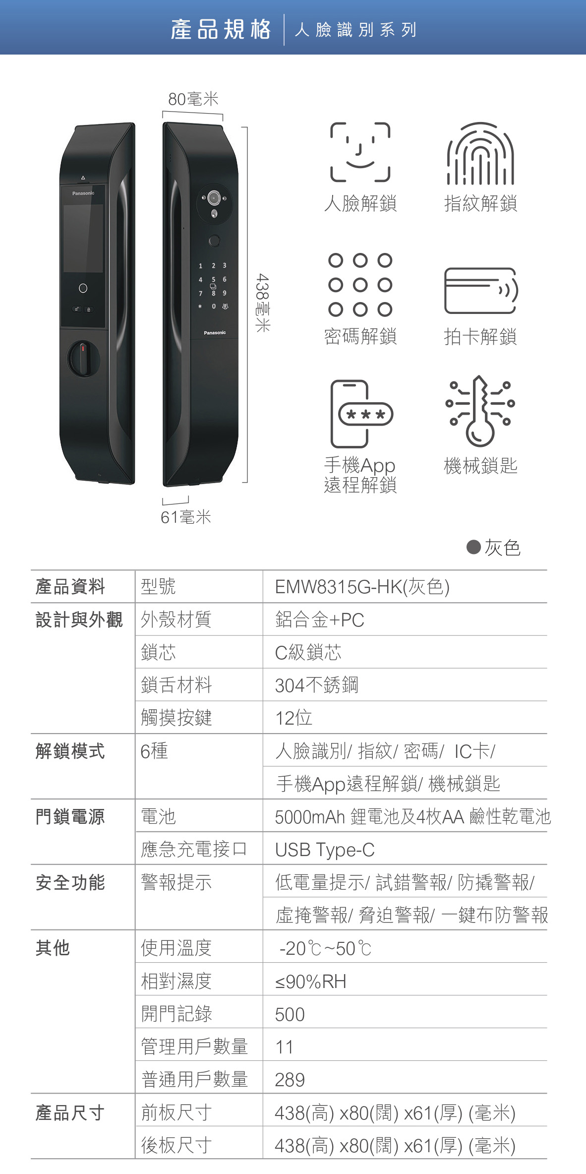 - Panasonic 樂聲 EMW8315G-HK 人臉識別系列 智能電子門鎖 (灰色) (已包基本安裝)
