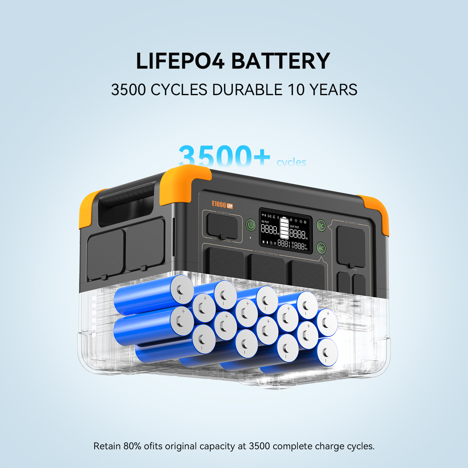 - 磷酸鋰鐵電池,循環壽命超過3500次,容量可達80%