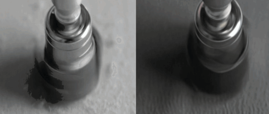 為了增強布料的耐磨性和解決防起毛問題,我們選擇增加布料密度和使用較強的纖維。我們將3.0主布(左)和新的4.0防起毛和加密尼龍布料(右)進行摩擦對比。使用相同的磨砂紙套在電鑽上,在兩塊布料上進行了約一分鐘(1500圈)的摩擦測試。