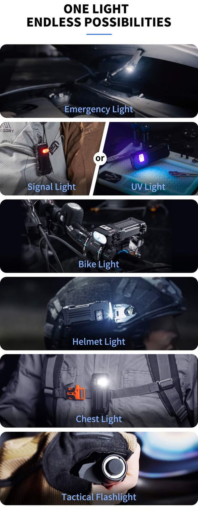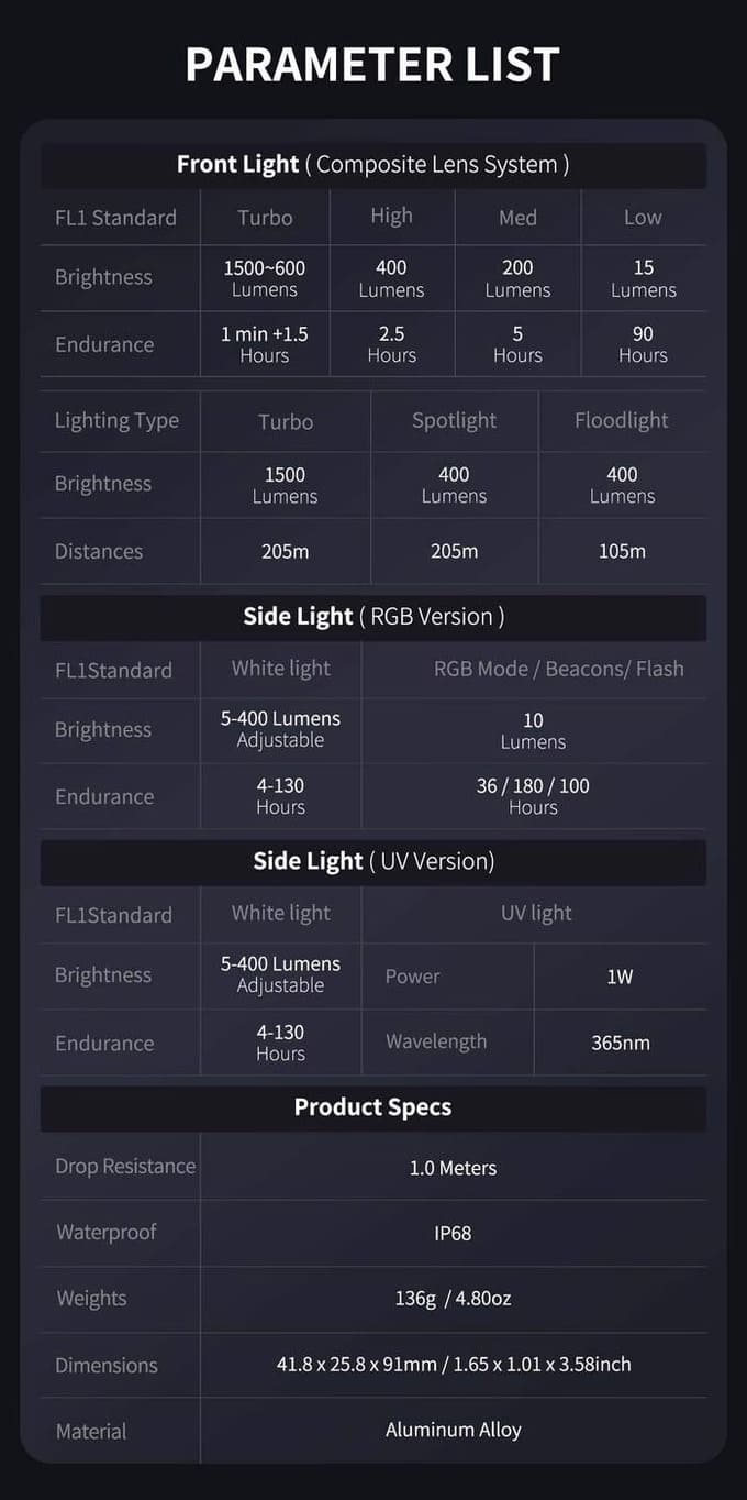 - 多模式側燈: 支援 400 流明白光、RGB 信號燈及 UV 燈,應對多場景需求。